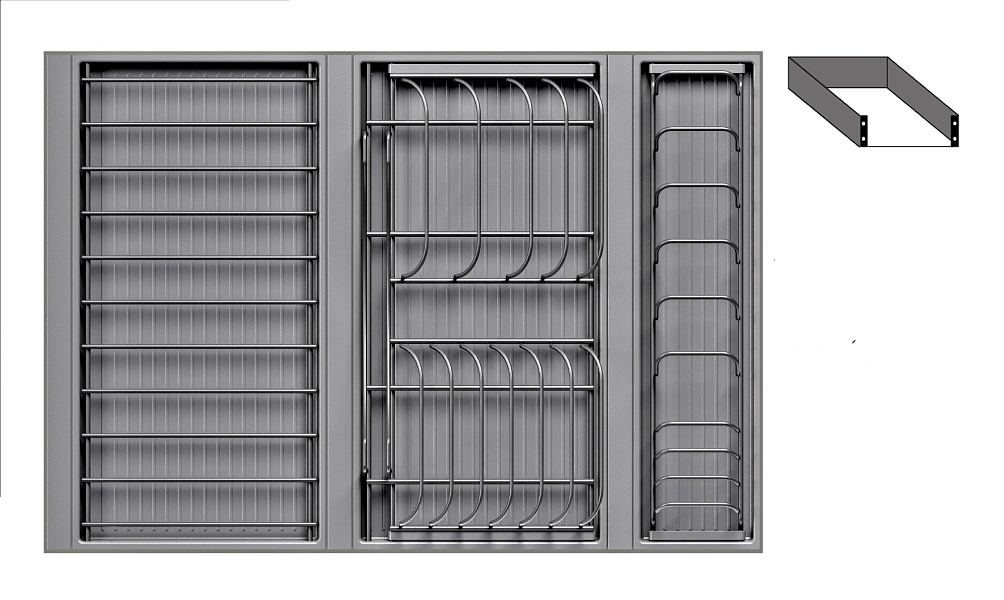 • 1 большой модуль для посуды + 1 большой модуль с решеткой + модуль для столовых приборов