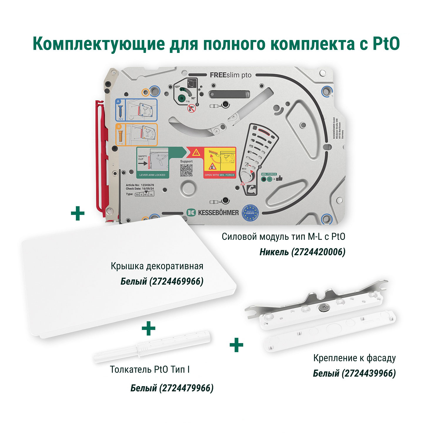 Полный комплект ультратонкого подъемного механизма ФриСлим ФЛАП Kesseböhmer c толкателем PTO тип I для накладного монтажа, цвет БЕЛЫЙ